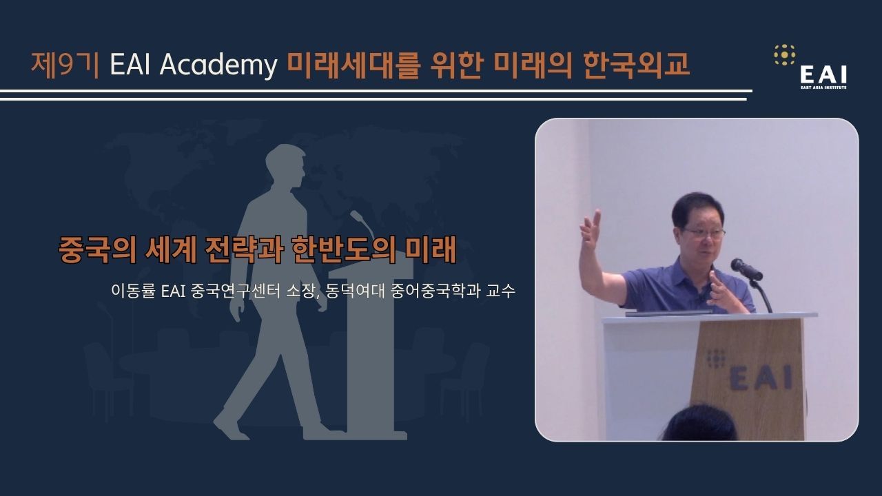 이동률 EAI 중국연구센터 소장(동덕여대 교수)은 1970년대 이후 중국 외교전략의 변화를 10년 주기로 나누면서 시진핑 집권기의 ‘중국 특색의 대국외교’와 운명공동체·신형국제관계 담론을 분석합니다. 이 소장은 중국의 대안적 국제질서 구상을 ‘차이나 퍼스트’에 비유하고 이를 국내 체제 안정을 우선하는 외교 기조로 해석합니다. 나아가 이 소장은 최근 대만 문제, 미국과의 전략 경쟁, 한반도 비핵화에 대한 중국의 인식을 짚으며, 한국이 미·중 사이에서 전략적 신중함과 유연성을 유지해야 한다고 제언합니다.