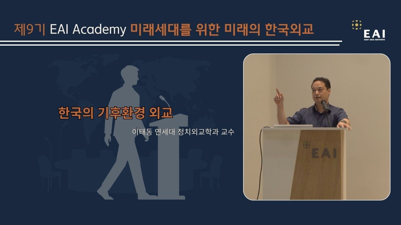 이태동 연세대 교수는 ‘한국의 기후환경 외교’를 주제로, 기후변화가 단순한 환경 문제가 아니라 안보·경제·외교와 긴밀히 연결된 과제임을 설명합니다. 이 교수는 한국의 온실가스 감축 목표와 탄소중립 전략, 교토의정서와 파리협정, 탄소국경조정제도(CBAM) 등 국제기후협력의 흐름을 짚으며 제도와 규범을 통한 대응의 필요성을 제시합니다. 또한, 이 교수는 기후 위기에 대한 대응을 위해서는 국가를 넘어 도시와 기업이 함께 제도적·기술적 혁신을 주도해야 한다는 점을 강조합니다.